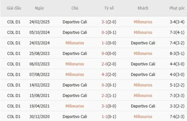 Millonarios đang áp đảo Deportivo Cali về thành tích đối đầu khi thắng 3/4 lần gặp nhau gần nhất trên sân nhà, ghi 7 bàn và chỉ thủng lưới 2. Tính trong 5 lần chạm trán gần đây, Millonarios thắng 3, hòa 1 và thua 1, trong đó có chiến thắng 3-0 ở lượt đi mùa trước. Về phong độ, Millonarios thắng 4/5 trận sân nhà gần nhất, ghi 9 bàn và giữ sạch lưới 3 trận, trong khi Deportivo Cali thua 3/4 chuyến làm khách vừa qua, để lọt lưới 7 bàn. Những con số này cho thấy lợi thế rõ rệt đang nghiêng hẳn về Millonarios trước màn tái đấu này.